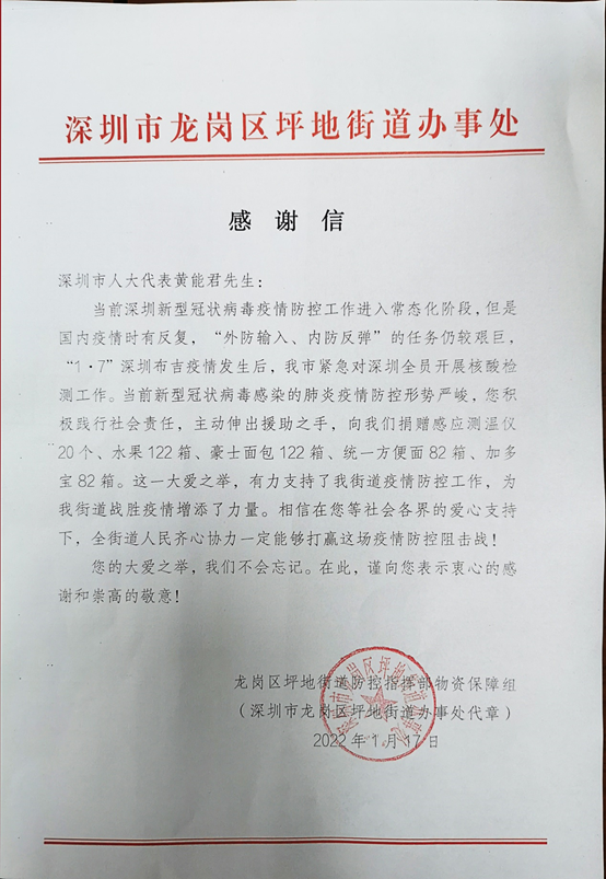 Since the outbreak of the "0107" new crown epidemic, as a local enterprise headquartered in Longgang District, Shenzhen, MTN has taken the initiative to fulfill its social responsibility. Representative of Shenzhen Municipal People's Congress and general manager of MTN Huang Nengjun actively participated in and supported Shenzhen's epidemic prevention and control work. On January 17, the company donated living materials and anti-epidemic materials to Pingxi Community, Pingdi Street, Longgang District, Shenzhen, to make a modest contribution to the community's epidemic prevention and control.